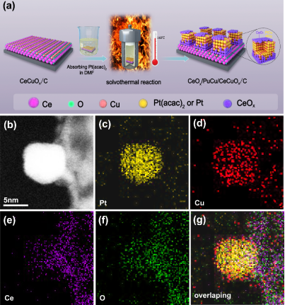 最近,我院聂瑶老师等人首创性利用低温溶剂热反应成功在Pt-CeCuOx体系诱导产生强金属-载体相互作用(SMSI),一步实现Pt-Cu合金化及PtCu表面CeOx包覆,革新Pt的相组成和催化构型所制备的CeOx/PtCu/CeCuOx/C催化剂在酸性电解质中表现出增强的电催化MOR活性、耐CO中毒能力和长期稳定性。密度泛函理论(DFT)计算结果指出,PtCu合金CeOx包覆层的形成同时诱导产生压缩应变效应、配体效应(从CuPt的电荷转移)和强Pt-CeOx电子相互作用这些效应和电子作用的耦合使CeOx/PtCu/CeCuOx/C中的Pt具有更多的缺电子特征和下移的d带中心,从而从本质上削弱了*CO的吸附能,有效地提高了其MOR活性和抗中毒能力。此外,CeOx的存在增强了*OHCeOx/PtCu界面上的吸附,最大程度地减少了*CO对相邻Pt活性位点的阻塞。