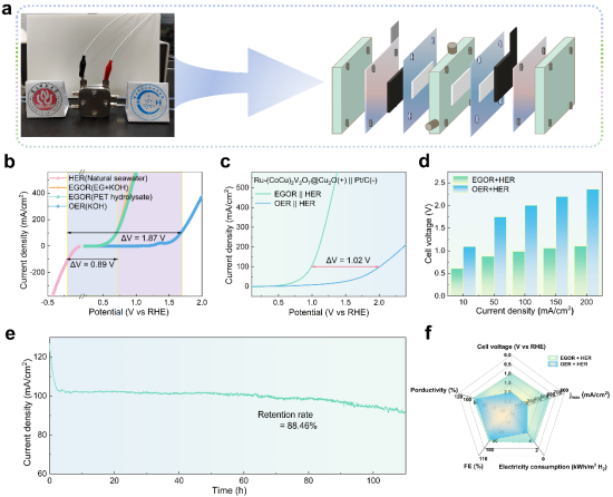 结果显示,该催化剂在EGOR中表现出卓越性能:仅需0.68 Vvs RHE)即可达到100 mA cm⁻2的电流密度,相较传统OER反应能耗降低60.1%。更值得关注的是,在1.0 Vvs RHE)、600 mA cm⁻²的工业级条件下,其生成高附加值GA的法拉第效率仍保持96.6%,选择性达93.5%,突破了现有催化体系的性能瓶颈。在流动池展现出优异的双功能产出能力:在200 mA cm⁻2电流密度下,可同时将PET水解液转化为GA(产率0.0299 mmol min⁻1),并从天然海水中制备氢气(产率1.531 mL min⁻1)。长期稳定性测试表明,该系统在100 mA cm⁻2下连续运行120小时,性能衰减不足12%,且整体能耗较传统海水电解制氢降低51.3%