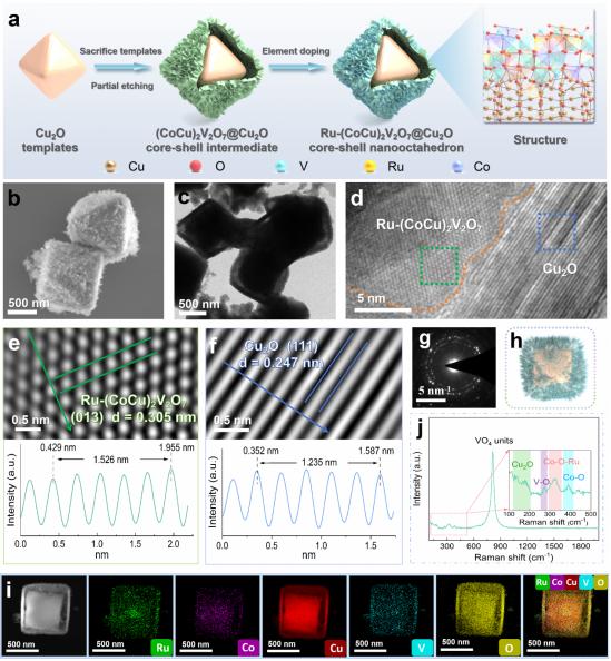 基于此,研究团队将亲氧过渡金属与贵金属结合,设计了一种富含Co–O–Ru不对称活性中心的Ru-(CoCu)2V2O7@Cu2O电催化剂,从而触发动态电子离域。这打破了EG分子的对称性,使得关键中间体(*OCCH2OH*OH)被靶向吸附,实现了单一羟甲基的定向去质子化。同时,利用电子离域特性调控反应路径,突破单一羟甲基的选择性氧化,并及时解吸C2产物使贵金属活性位周期性恢复,避免深度氧化,提高GA选择性。