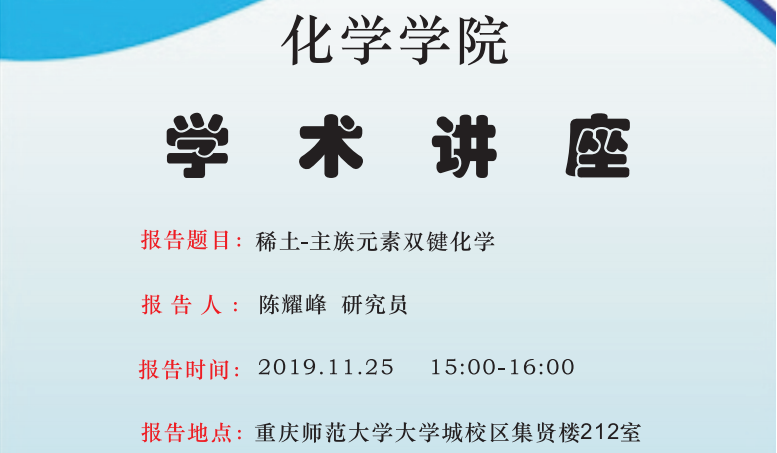 2019年11月25日下午,我院邀请中国科学院上海有机研究所陈耀峰研究员来开展“稀土—主族元素双键化学”主题讲座,参加本次讲座的有部分青年教师及研究生全体成员,本次讲座由院党委书记唐敏主持。