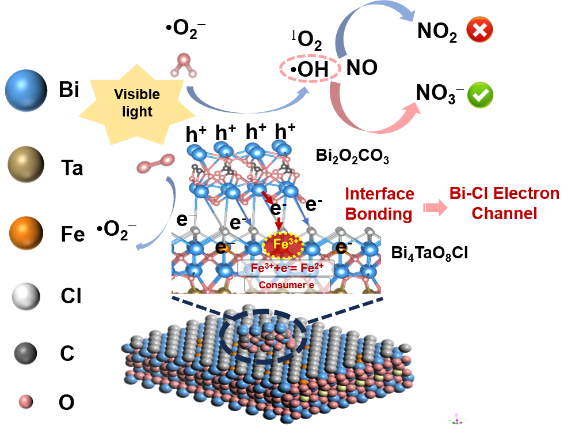 氮氧化物(NOx)是大气污染的“元凶”之一,其中一氧化氮(NO)的净化一直是环保领域的难题。传统技术难以实现高效且选择性地将NO转化,还容易在净化过程中产生毒性更强的二氧化氮(NO₂),进一步加剧空气污染,危害人体健康。我校化学学院的科研团队成功研发出一种新型复合光催化剂Bi4TaO8Cl/Bi2O2CO3-Fe。他们巧妙地构建了异质结,并引入Fe³⁺作为电子受体中心,为解决NO净化难题提供了创新方案。该研究发现,Fe³⁺在光催化过程中具有“双重身份”。一方面,它能够增强界面电子转移,让光生载流子的分离效率大幅提升;另一方面,Fe³⁺可以激活表面位点的H₂O,促使具有强氧化性的羟基自由基(・OH)生成。并且,优化后的异质结光催化剂,NO转化率高达68.19%,而NO₂选择性却低至10.98%,能有效抑制NO₂的产生,将NO高效转化为稳定的硝酸盐(NO₃⁻)。电子自旋共振(ESR)和活性氧物种(ROS)猝灭实验表明,Fe³⁺驱动的电子迁移使表面空穴富集,H₂O吸附量增加,・OH生成量提升了2.76倍。强大的氧化能力使得・OH在光催化NO氧化过程中,能够有效抑制NO₂的生成,推动NO完全氧化为NO₃⁻。这项研究成果为选择性去除NO提供了新的策略,为设计环保型光催化剂提供了关键思路,在大气污染治理领域具有广阔的应用前景。未来,随着该技术的进一步发展和应用,有望为改善空气质量、打赢蓝天保卫战贡献重要力量。