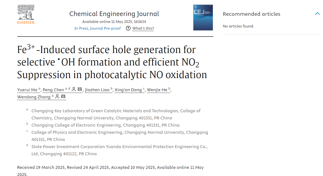 近日,我校化学学院科研团队在国际高水平期刊《Chemical Engineering Journal》(SCI一区TOP,IF=13.4)在线发表了题为“Fe3+-Induced Surface Hole Generation for SelectiveOH Formation and Efficient NO2Suppression in Photocatalytic NO Oxidation”的研究论文,化学学院硕士研究生马悦芮为第一作者、陈鹏副教授和张文东研究员为通讯作者。