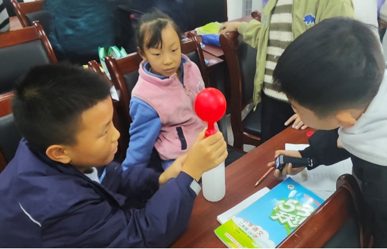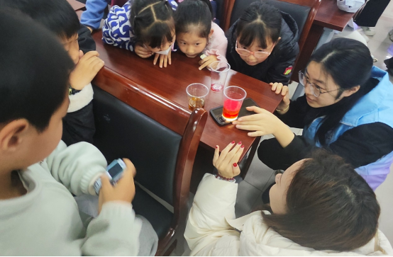 志愿者们还结合自身专业特色,设计了趣味化学实验。首先紫甘蓝变色实验——紫甘蓝汁液在不同酸碱度下的颜色变化志愿者的精心操作之下,杯子里的溶液很快呈现出绚丽色彩,这调动了孩子们的好奇心,激发了他们探索的欲望,个个热情高涨兴致勃勃。接下来,小朋友们分组亲手操作进行火山熔岩灯和柠檬酸与小苏打吹气球实验。在志愿者的照看和帮助下,气球随着瓶子的震荡很快鼓了起来。而那火山熔岩灯也发出通红的颜色,杯子里不断翻涌着气泡,好像真的火山喷发。实验结束后,小朋友们仍意犹未尽,沉浸在做实验与观察现象中无法自拔。