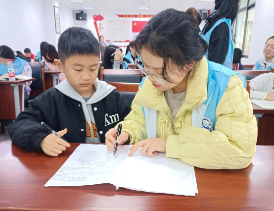小朋友们陆陆续续到达社区准备的教室,未来教师协会的吕兰同学为每个小朋友分配一名志愿者,对孩子们进行一对一辅导志愿者自我介绍后开始了解孩子们的基本状况,原本沉默的气氛也变得活跃起来。在辅导期间,同学们先是认真地给孩子们讲解书中的知识,仔细地解答孩子们在学习中遇到的困难帮助孩子彻底理解知识。更加细心的是,志愿者们还讲了一些学习方法和学习技巧,帮助他们快速掌握学习的要领。