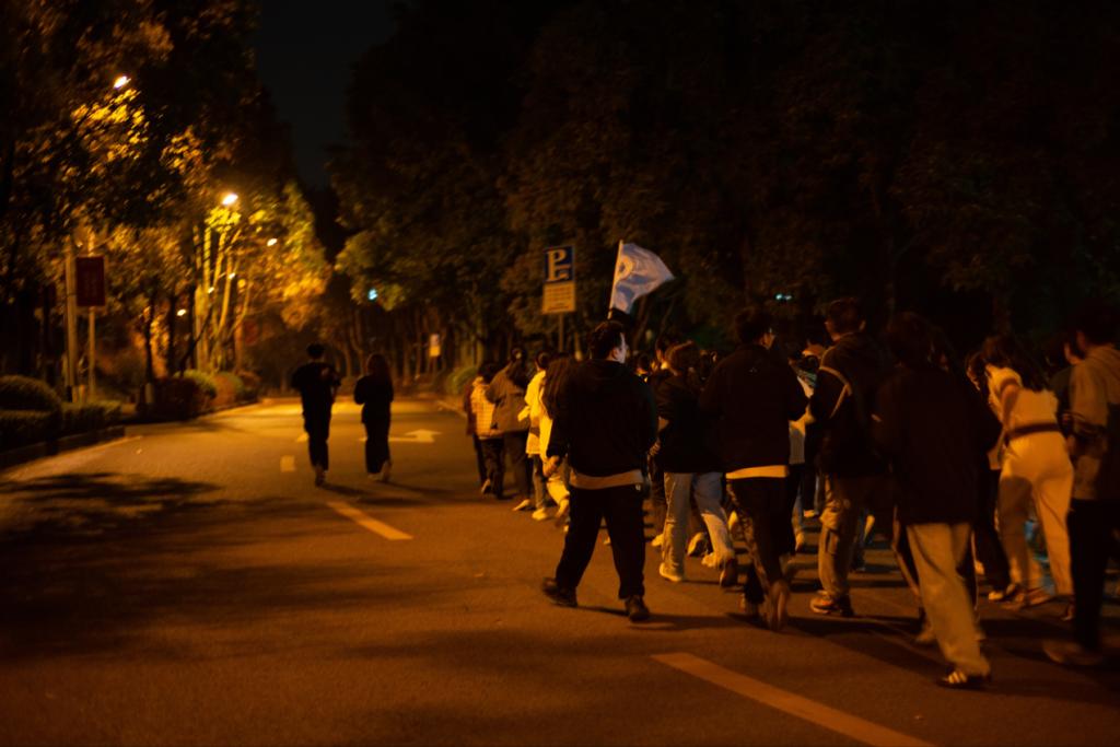 慷慨激昂的宣讲后,便是简单的热身。随后何乐尧学长手举化院夜跑旗帜带领同学们开始了今晚的夜跑。队伍浩浩大大,整齐划一。同学们随着自己的节奏一呼一吸,步伐整齐,铿锵有力。暖黄色灯光下映射的影子由浅入深;夜风中吹拂着飞扬的头发,无不展现出同学们激昂的青春活力。荧光手环在清冷的月光下熠熠生辉,仿佛象征着同学们青春的色彩。队伍从求是楼出发,沿途是熟悉的知行楼、博雅楼和第一操场,绕操场一圈后又眼看弘德楼、图书馆消失在视野中,最终返回求是楼签到打卡。同学们迈着整齐的步伐,在带领下有序完成了夜跑。尽管已经累得满头大汗,气喘吁吁,但是没有一人选择退出,正是这种拼搏不放弃的精神激励着同学们坚持到了最后。