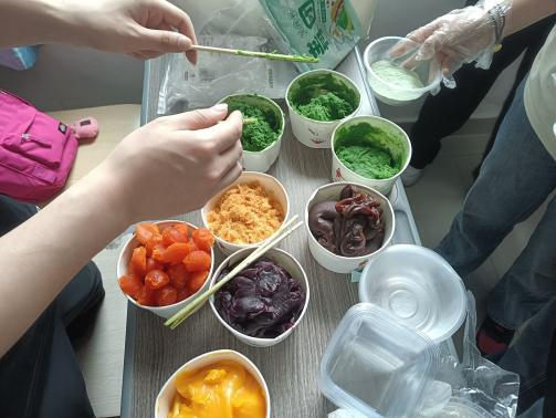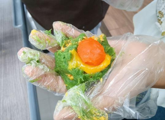 在动手实践环节,同学们纷纷化身“青团小能手”,根据教程和工作人员的指导,亲手制作属于自己的青团。他们认真地将艾草汁与糯米粉混合,揉成面团,再包裹上自己喜欢的馅料,制作成形状各异的青团。在同学们的巧手下,一个个圆滚滚的青团出现在了桌面上,充满了春天的气息。