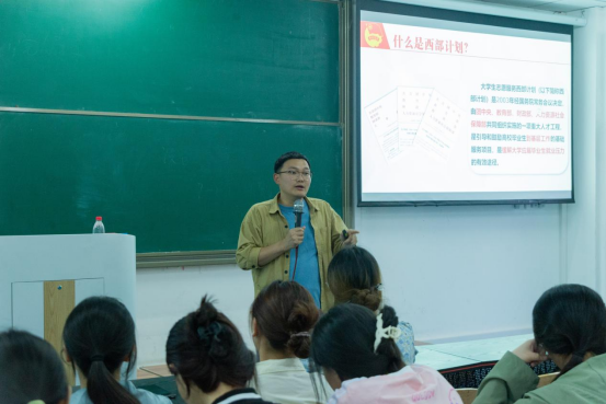 宣讲进程中,孙玖江详细介绍了西部计划的报名流程、服务内容、政策支持以及个人发展等方面的信息。同时,还就学生们关心的问题进行了现场答疑,帮助学生们更全面地了解西部计划,消除了他们的疑虑。
