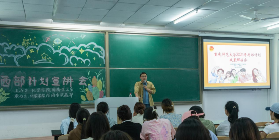 为了响应国家对西部大开发战略的号召,激发学生服务西部的热情,化学学院团委实践部邀请到重庆师范大学团委综合科科长孙玖江老师于2024年5月5日在励志楼T2409成功举办关于“西部计划”宣讲活动。全院200余名同学参与了此次活动。