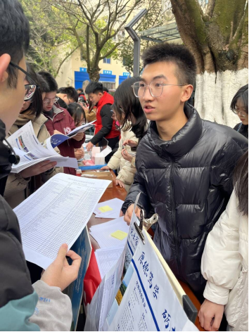 蓝玉田、张敉睿、 何科桦向同学们分发M88宣传资料并现场为其解答相关困惑