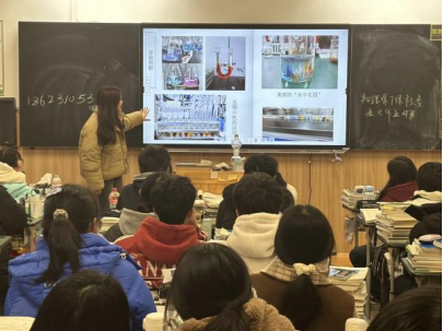 文雅在向学弟学妹们分享化学学院实验的趣味图片,吸引了同学们的目光。