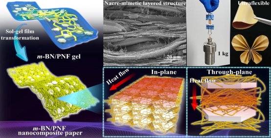 随着电子器件和电气设备不断朝微型化、集成化发展,使其内部热量积聚现象愈发严重,这对聚合物基导热复合纸的导热性能提出了更高要求。此外,为了避免微型电气部件之间形成短路电流,且信号相互干扰,电子电气领域用聚合物基导热复合纸还应具有优异的电绝缘性能和耐热性能等,以满足在实际电子工程中的应用。该研究成果通过“溶胶-凝胶”薄膜转化工艺将表面功能化的氮化硼(m-BN)与聚对苯撑苯并二噁唑纳米纤维(PNF)均匀复合,制备出仿贝壳珍珠层结构的m-BN/PNF纳米复合纸。基于m-BN与PNF之间的氢键和π-π电子相互作用,m-BN/PNF纳米复合纸具有优异导热性能和出色电绝缘性能,其λ∥和λ⊥分别为9.68 W/(m·K)和0.84 W/(m·K),体积电阻率和击穿强度为分别高达2.3×1015 Ω·cm和324.2 kV/mm,有望在电子器件和电气设备等领域获得广泛的应用。