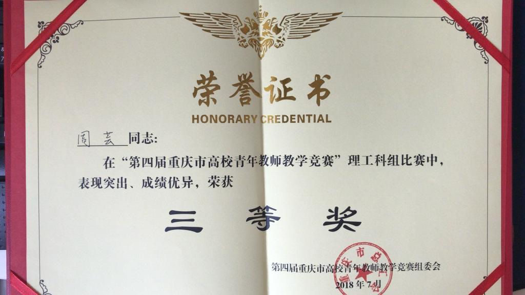 2018年7月4日至5日,由重庆市总工会、重庆市教育委员会主办,重庆市教科文卫体工会、重庆文理学院承办“第四届重庆市高校青年教师教学竞赛”在重庆文理学院隆重举行,我院青年教师周芸教授获理工科组三等奖,我校获得了此次竞赛的“优秀组织奖”。本届竞赛共有来自全市35所高校的97名教师参赛,分人文科组、理工科组、思政专项组3个组别,和教学设计、课堂教学两个环节进行展示。